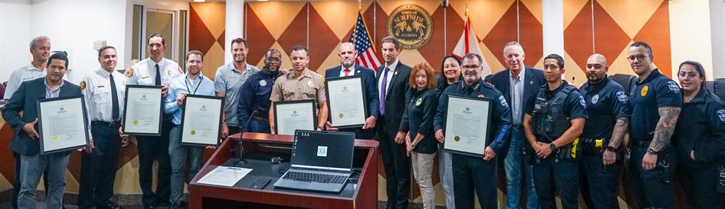 The Town of Surfside learned first-hand that heroes stand among us from all walks of life. On June 24, 2021, and for many weeks after, these individuals and organizations tirelessly poured every ounce of effort, heart and sweat into their support for Surfside when it was most needed. At the June 13 Commission Meeting, Mayor Danzinger and the Town Commission were joined by State Senator Shevin Jones in presenting Town Employees, Surfside Police, Miami-Dade Fire Rescue, Miami-Dade County Police, Israeli Consul General Maor Elbaz Starinsky on behalf of the State of Israel and Hatzallah of South Florida with the 2023 Surfside Heroes Month proclamation.