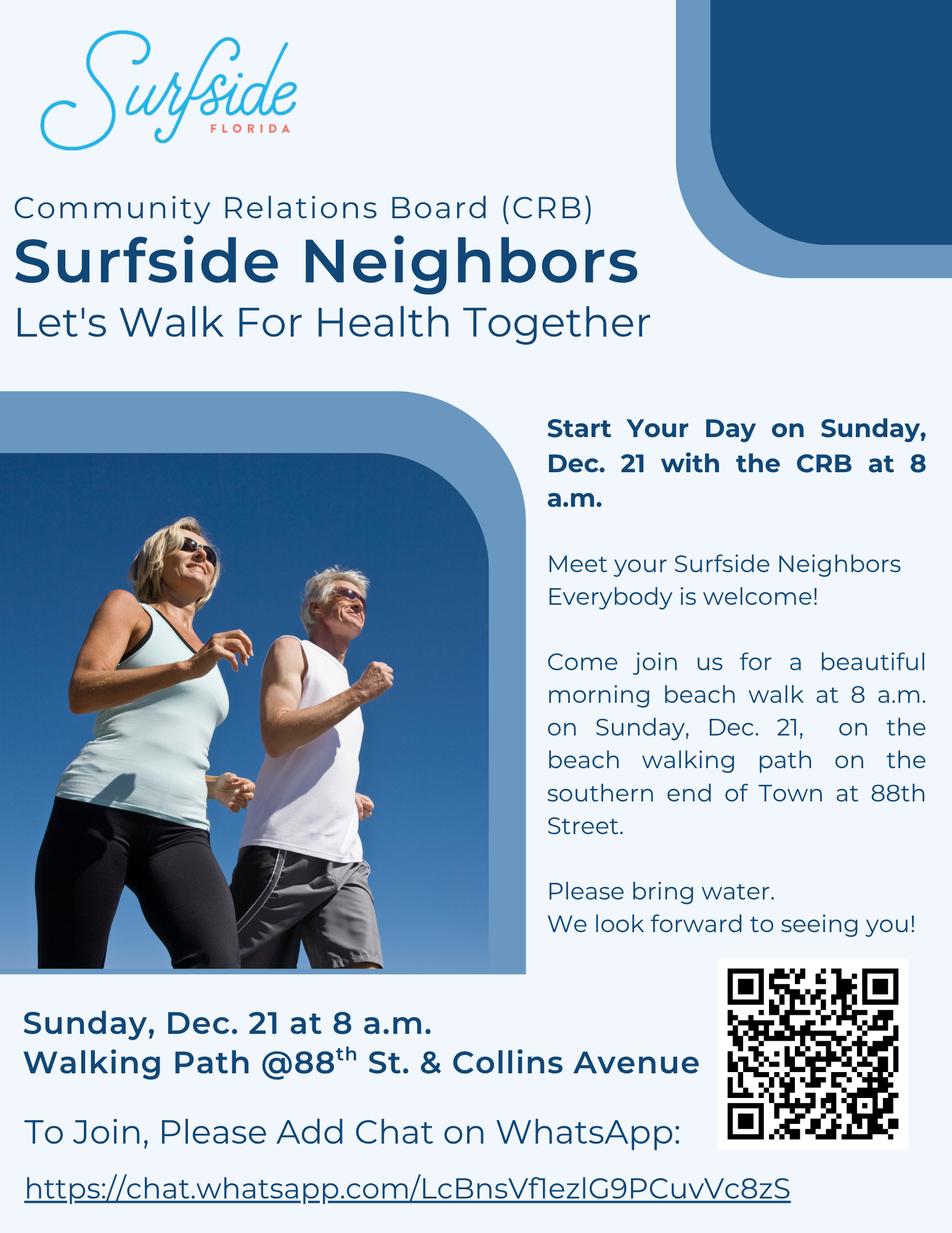 Start Your Day on Sunday, Dec. 21 with the CRB at 8 a.m. Meet your Surfside neighbors. Everybody is welcome! Come join us for a beautiful morning beach walk at 8 a.m. on Sunday, Dec. 21, on the beach walking path on the southern end of Town at 88th Street. Please bring water.