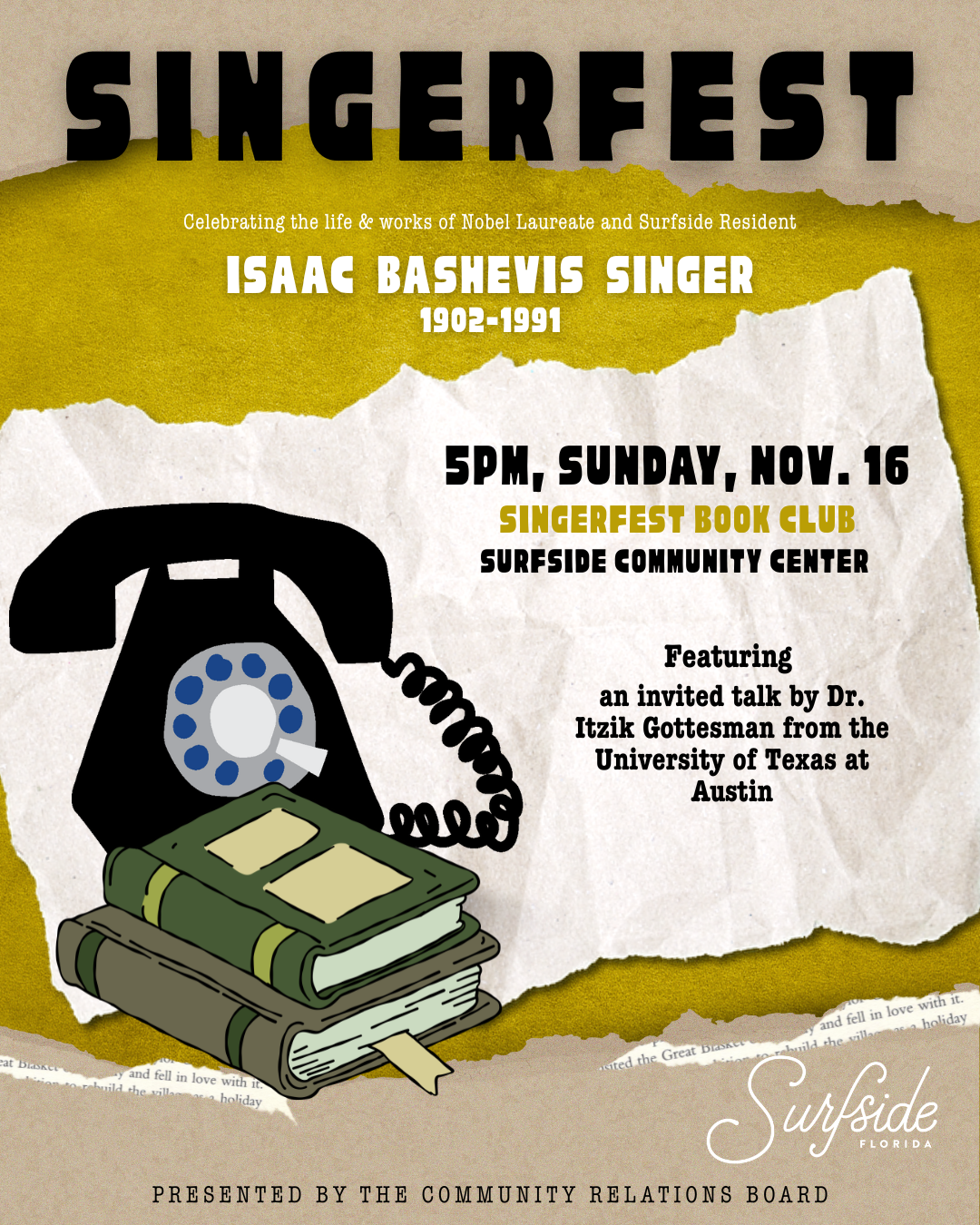 Surfside's Community Relations Board (CRB) invites you to the Book Club portion of Singerfest, a special celebration honoring Nobel Prize–winning author and former Surfside resident, Isaac Bashevis Singer. Readers and fans are invited to take part in a lively discussion led by Dr. Itzik Gottesman from the University of Texas at Austin exploring Singer’s timeless stories, rich in humor, mysticism, and human insight. The four stories that will be featured in the Book Club, "Gimpel the Fool," "Alone," "Old Love," and "The Last Demon," are part of The Collected Stories of Isaac Bashevis Singer. Residents and the public are welcome to participate on Sunday, November 16 at 5 p.m. in the Community Center Fish Bowl—come ready to read, reflect, and celebrate the enduring legacy of one of the 20th century’s greatest storytellers.
