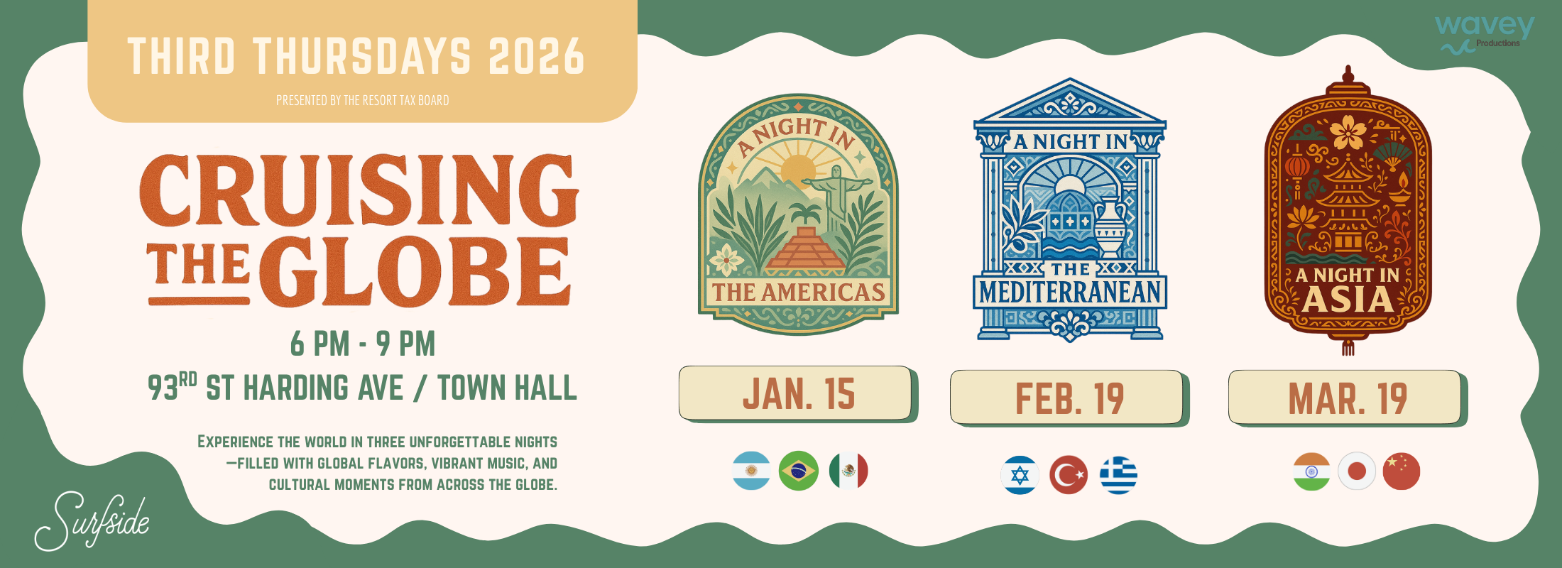 🌍The Surfside Resort Tax Board is proud to announce the 2026 Third Thursdays “Cruising the Globe” series—an elevated block party experience bringing the world to Surfside. Hosted at 93rd Street Town Hall, this lively monthly celebration will transform the area into a global destination, featuring three unforgettable regions and 9 amazing countries filled with vibrant culture, immersive activities, and festive energy for the entire community to enjoy.