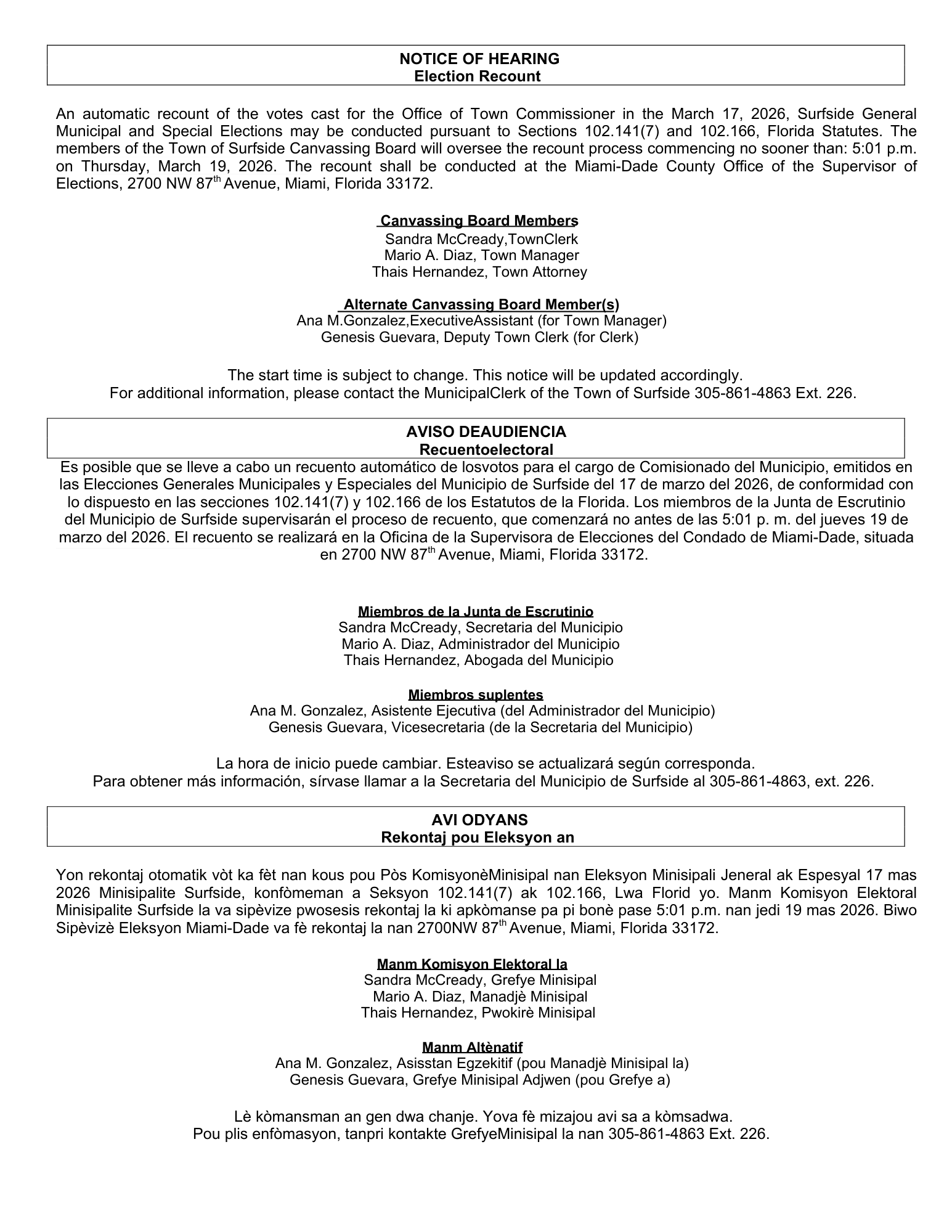 Miami-Dade County Supervisor of Elections Issues Notice of Automatic Recount