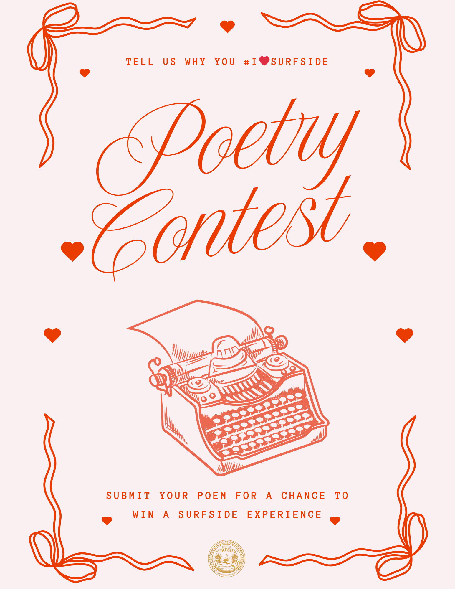 The Town of Surfside invites residents of all ages to participate in a first-of-its-kind community poetry contest celebrating the creativity and spirit of our Town. Share your original poem inspired by Surfside—its beaches, community, or what makes it special—and let your voice be heard!