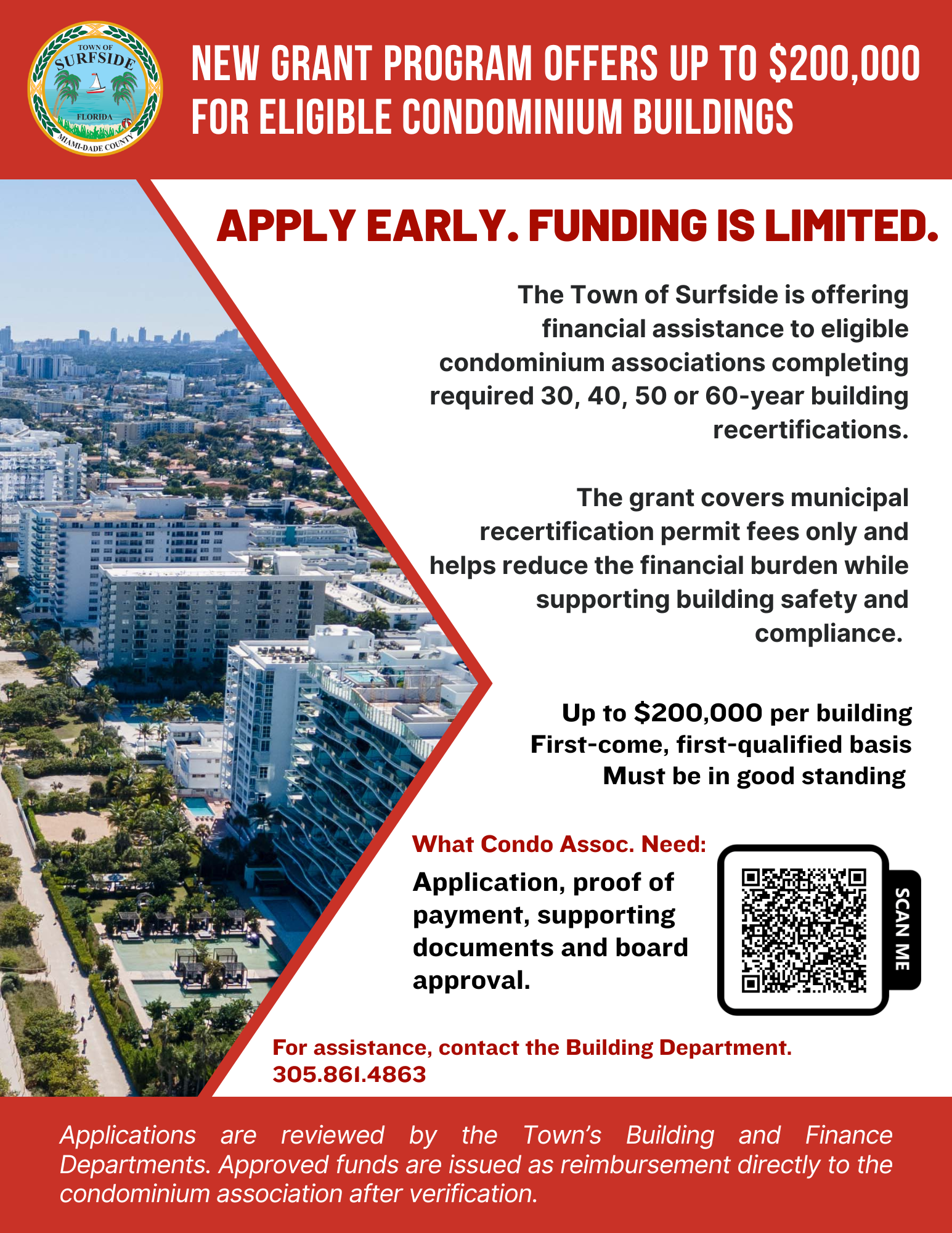 To qualify, applicants must be condominium buildings located within the Town of Surfside that are subject to mandatory recertification. Buildings must also be in good standing, with no outstanding liens, unresolved code violations or unpaid municipal obligations, unless under an approved compliance plan.